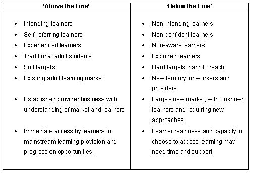 Working below the line means targeting non-traditional adult learners, who have proved hard-to-reach through traditional methods. Developing ways of working, which will encourage and enable them to take up learning opportunities.