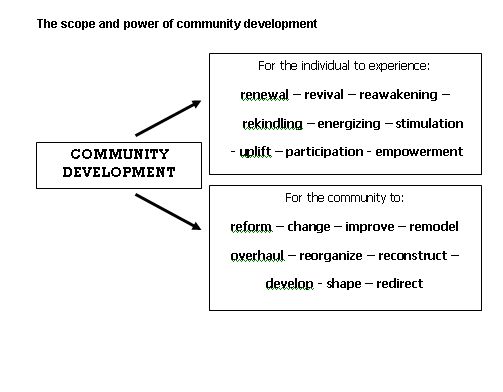 1. COMMUNITY DEVELOPMENT – any activity, which seeks to engage people in developing and improving the quality of their experience of life in their community